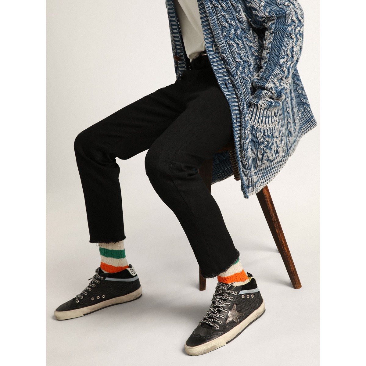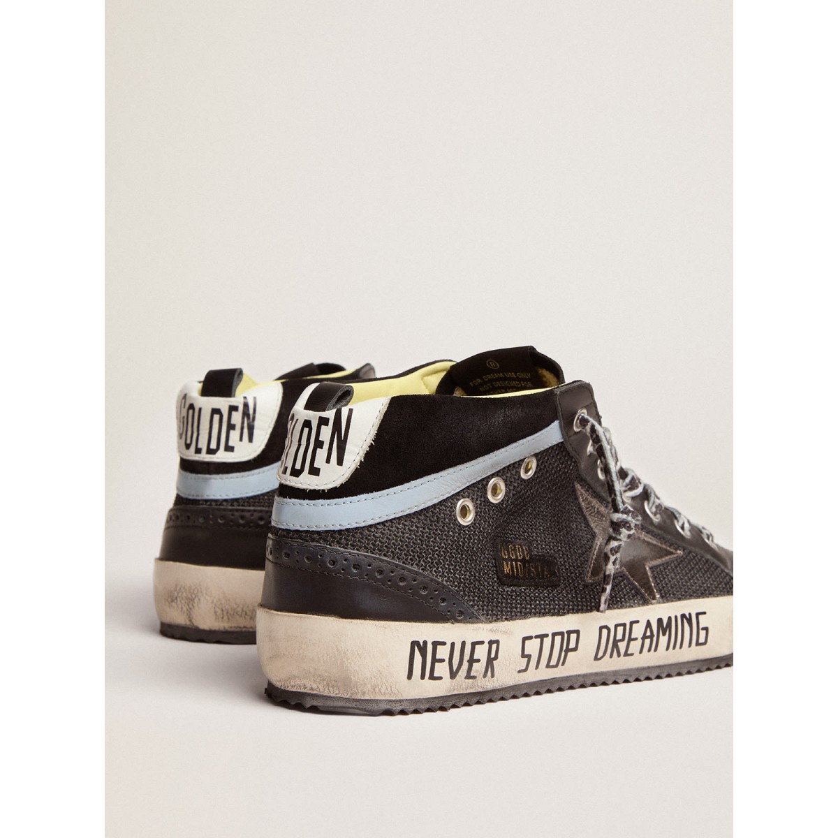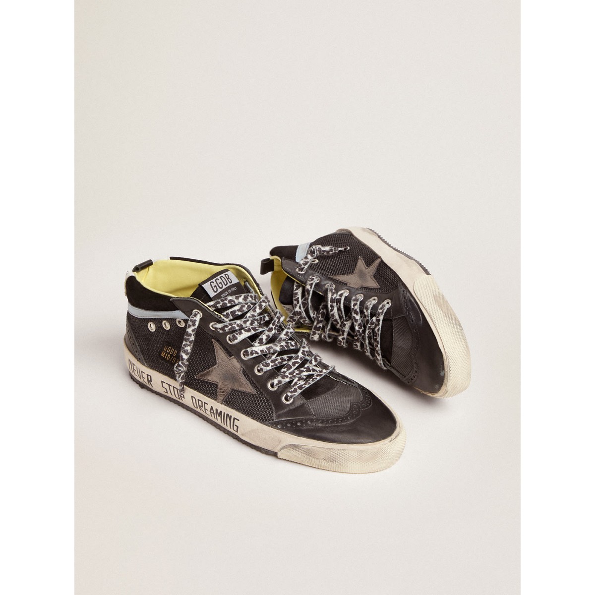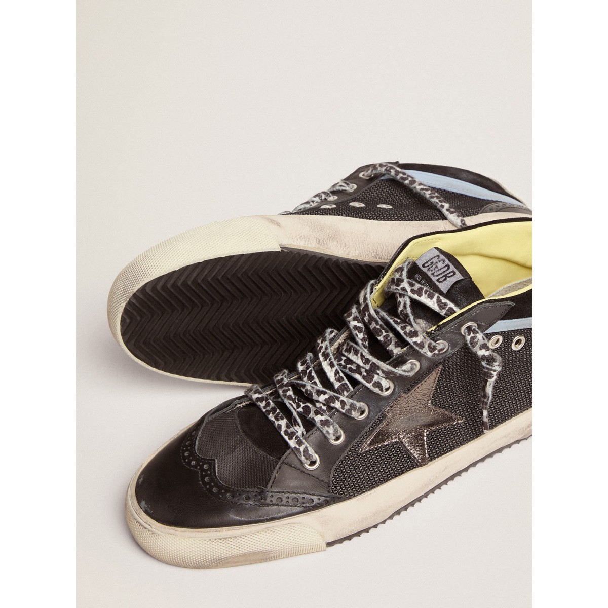 Versatilità univoco elegante: le Scarpe Ginnastica a metà stella adottano un approccio raffinato alla loro ispirazione per la scena di pattinaggio degli anni ’80. Queste scarpe da ginnastica con in pelle nera e tomaia in mesh presentano una stella metallica in pelle grigio scuro e una linguetta in pelle bianca. Inserti in pelle nera con brogliare, un flash in pelle azzurro e lacci per impronte leopardati in bianco e nero completano il look.