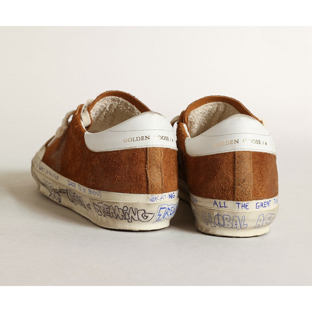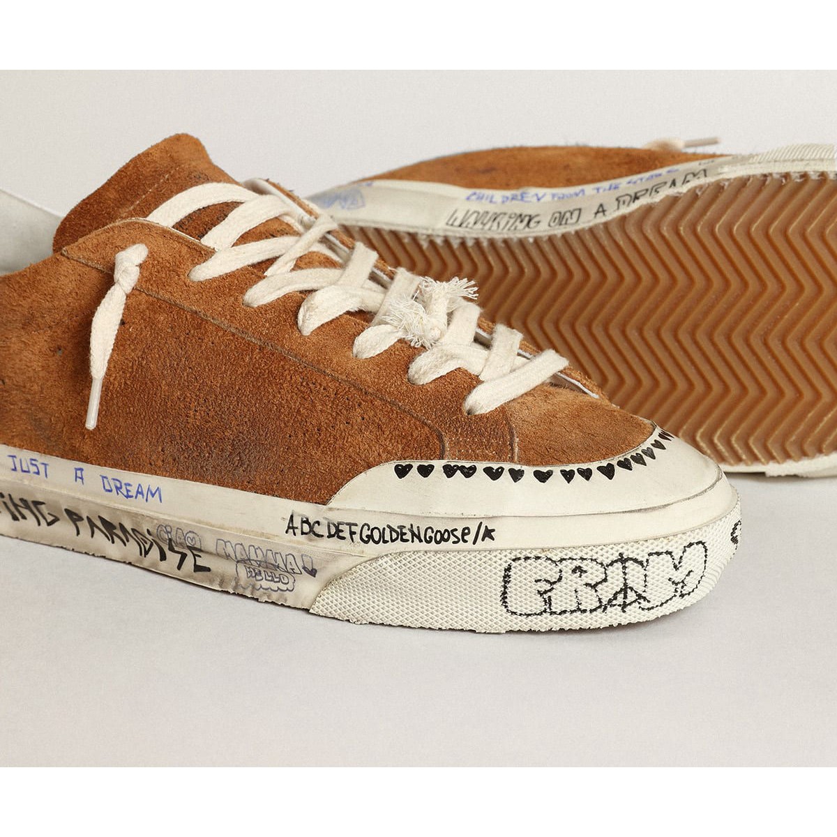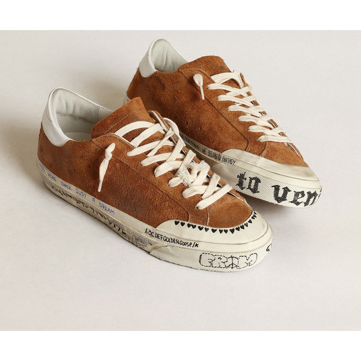 Un’icona senza tempo, ma una che si sta trasformando in evoluzione. A Golden, adoriamo prendere i nostri classici e rielaborarli sempre, sempre da una nuova prospettiva. Con la tomaia in pelle scamosciata con tan-tan-tanstretta, questo modello da uomo si distingue per una stella perforata e una linguetta di tacco in pelle bianca. The all-over contrasting lettering on the foxing, and the cream laces add the finishing touch.