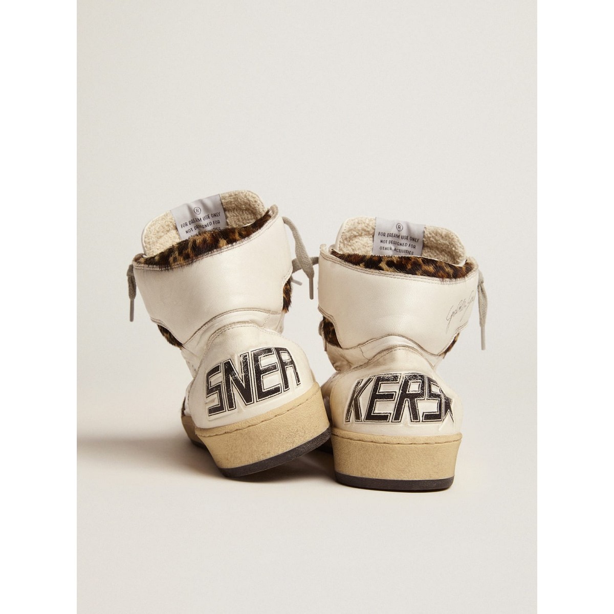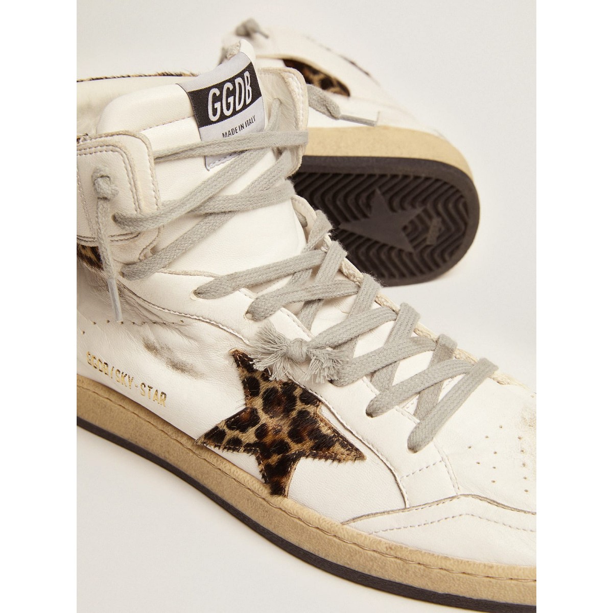 Una reinterpretazione di Scarpe Ginnastica alte con un’anima autentica: ispirata alla nostra modella a stella da ballo, le nostre Scarpe Ginnastica sky-star hanno un’atmosfera universitaria americana e un’atmosfera della scena di basket degli anni ’80. Realizzato in pelle di nappa bianca con inserti per la pelle di pony con stampa leopard>Dettagli: