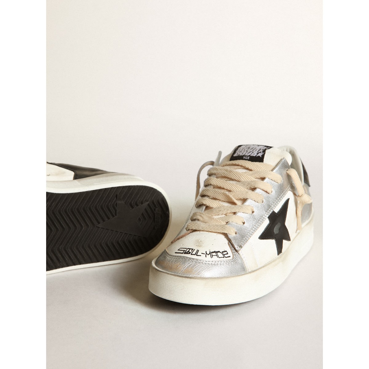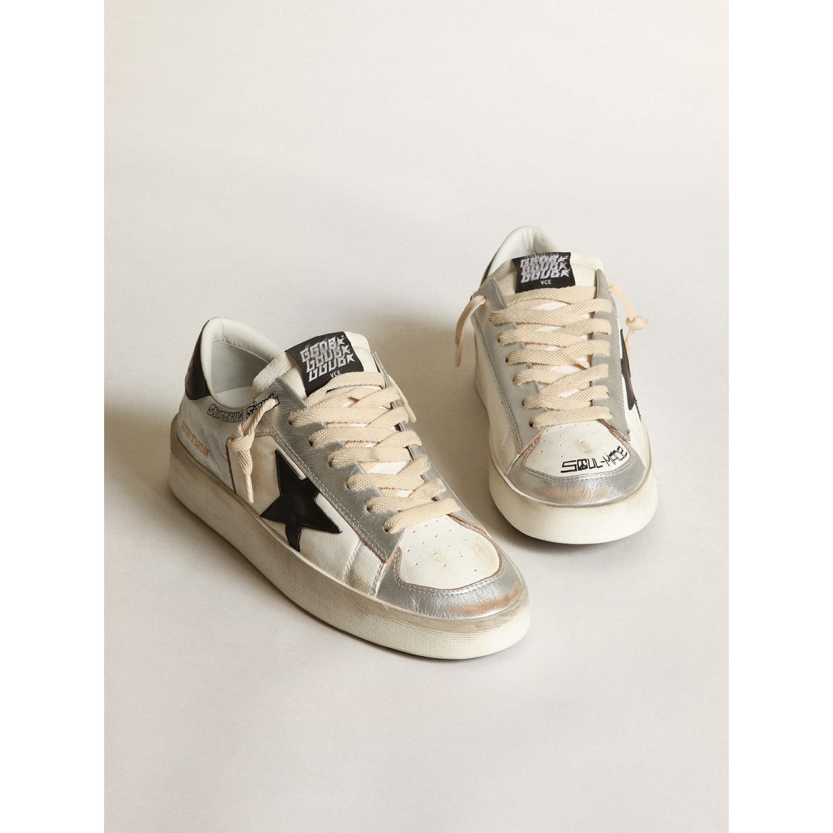 I gloriosi novanta si sono avvolti in una Scarpe Ginnastica. Le Scarpe Ginnastica Stardan rendono omaggio alle icone di basket di quel decennio, tenendo d’occhio il presente. Questa versione da uomo con una tomaia in pelle metallica argentata accentuata da inserti in pelle Nappa bianca presenta una stella in pelle nera e una linguetta del tallone. Le lettere stampate con schermo nero e lacci color crema aggiungono i tocchi finali.