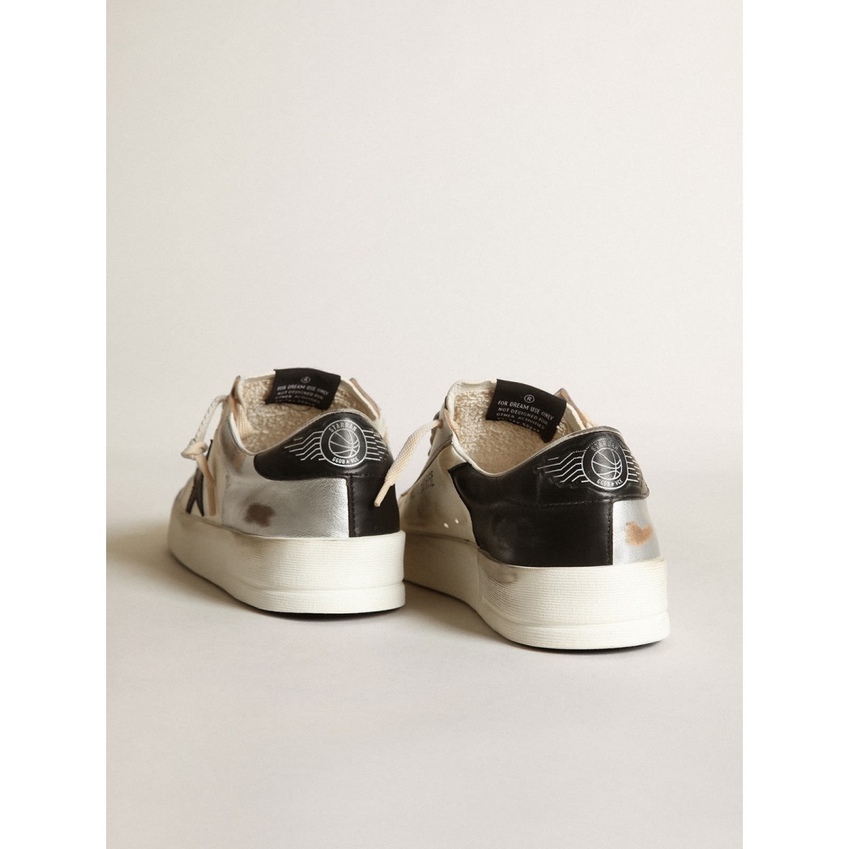 I gloriosi novanta si sono avvolti in una Scarpe Ginnastica. Le Scarpe Ginnastica Stardan rendono omaggio alle icone di basket di quel decennio, tenendo d’occhio il presente. Questa versione da donna con una tomaia in pelle laminata in argento accentuata da inserti in pelle Nappa bianca presenta una stella in pelle nera e una linguetta del tallone. Le lettere stampate con schermo nero e lacci color crema aggiungono i tocchi di finitura.