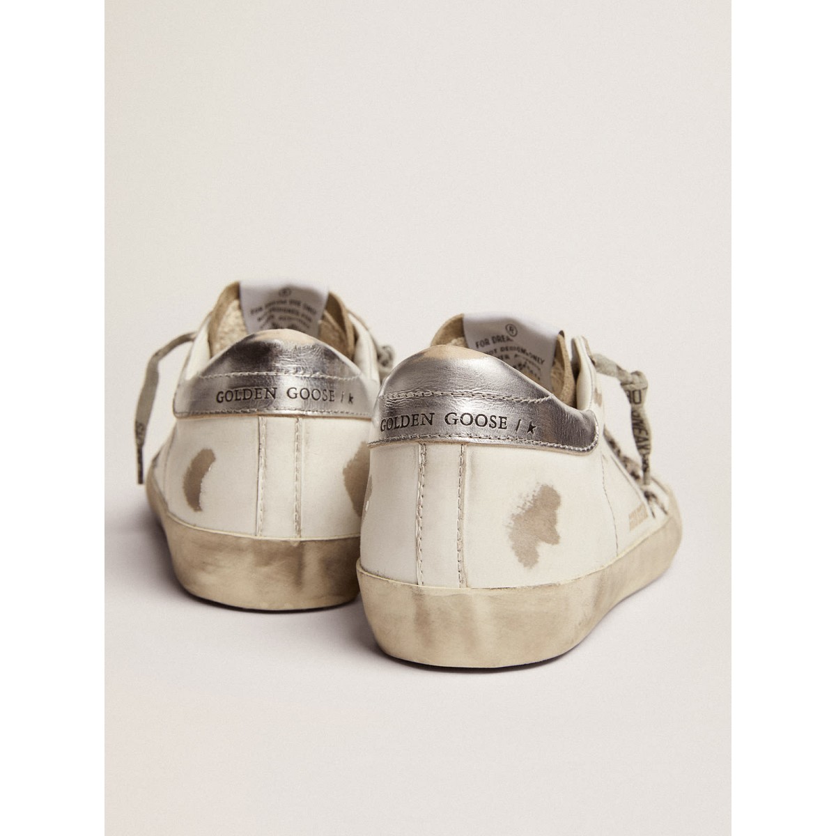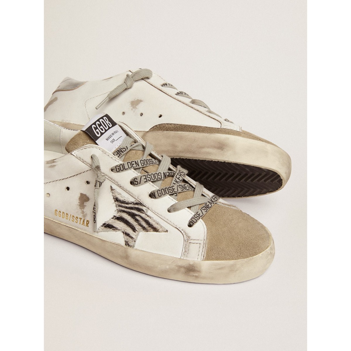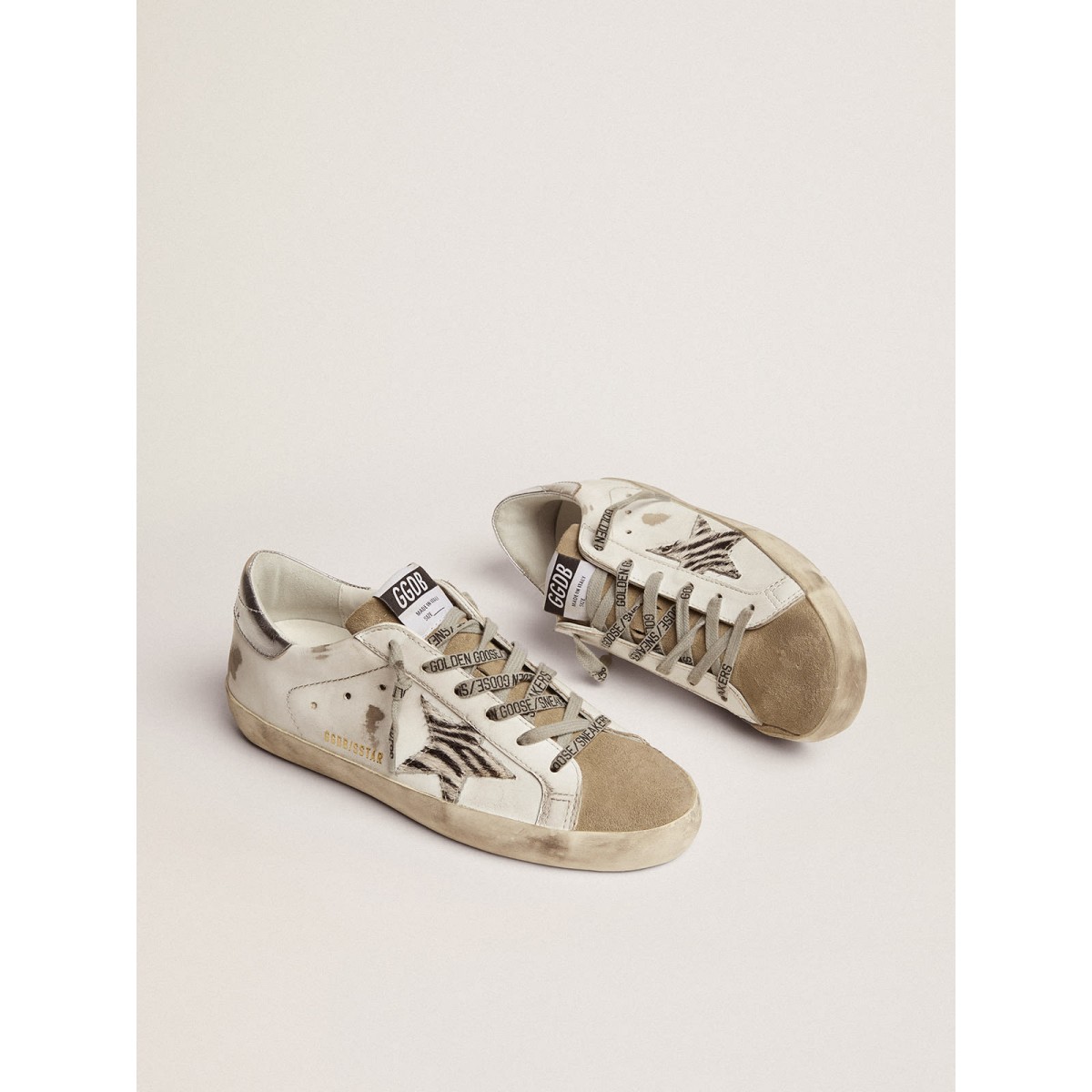 Un’icona senza tempo eppure è in continua evoluzione. A Golden, adoriamo prendere i nostri classici e rielaborarli sempre, sempre da una nuova prospettiva. Queste scarpe da ginnastica super star con una tomaia in pelle bianca presentano una stella per la pelle di pony con stampa zebra e una linguetta in pelle laminata in argento. E il toecap e la lingua in pelle scamosciata color sabbia aggiungono i tocchi finali.