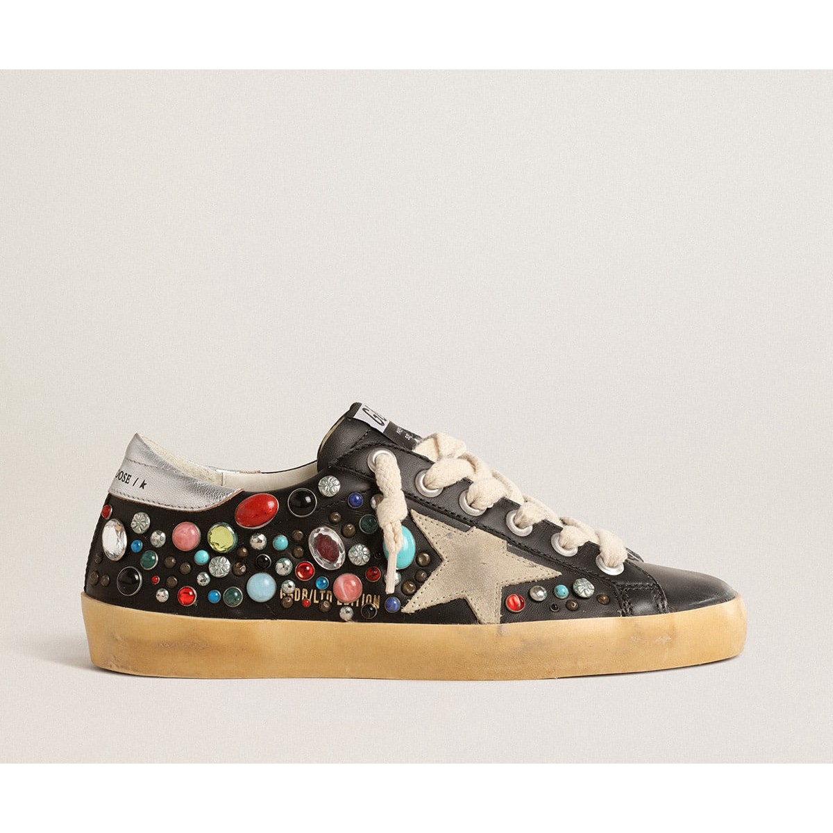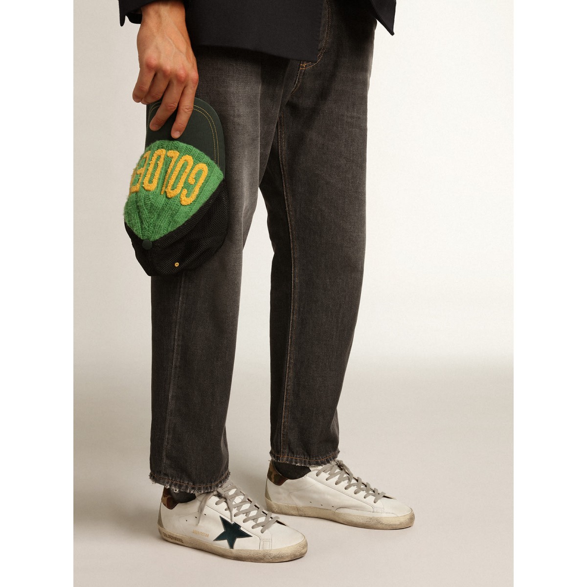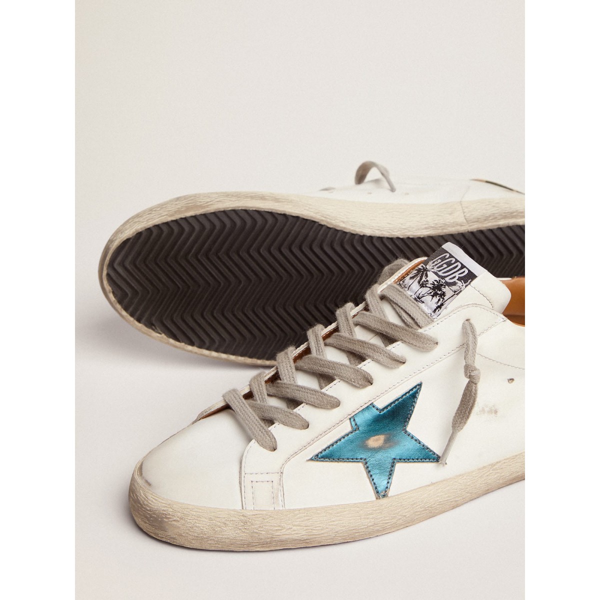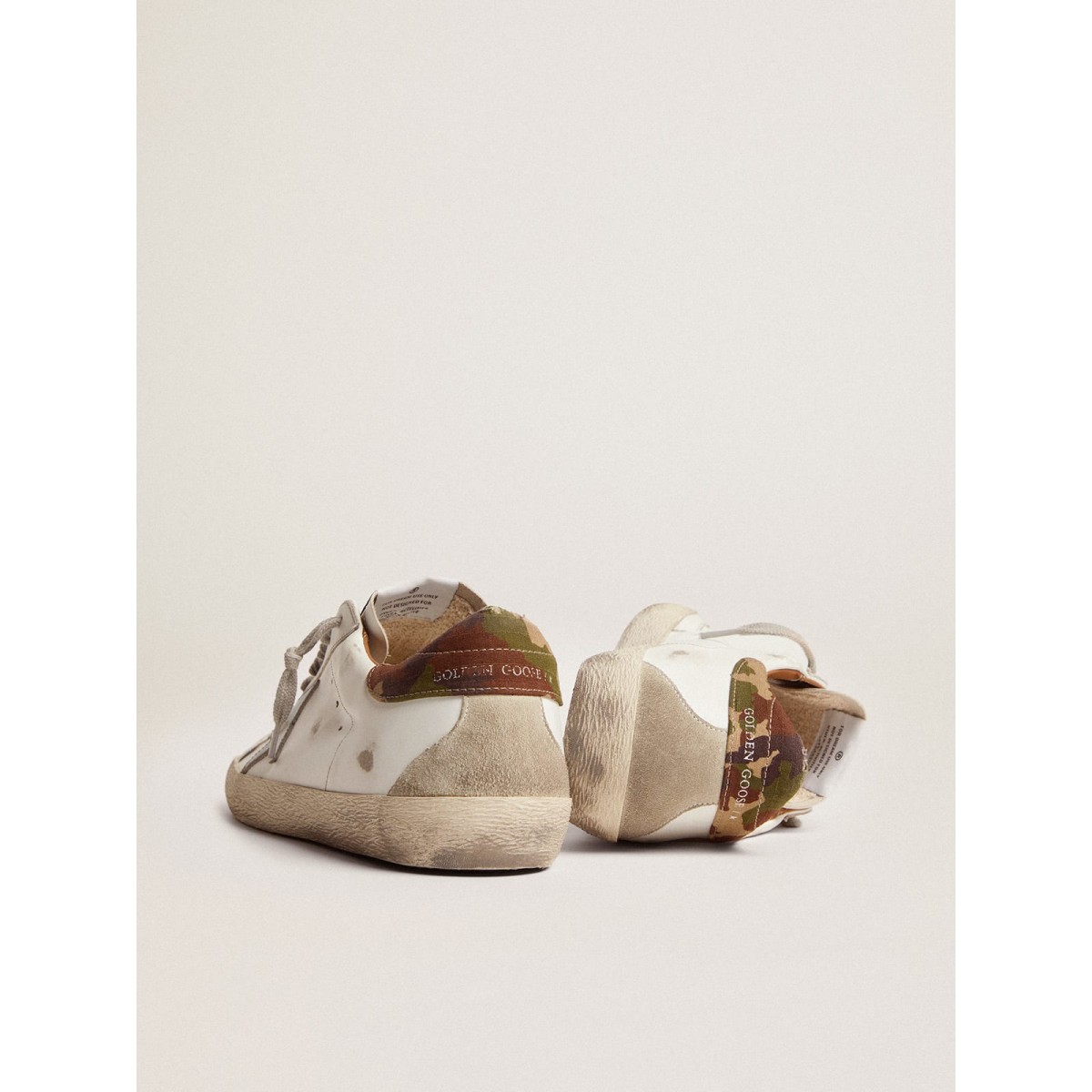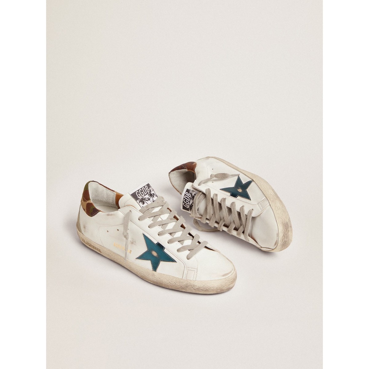 Un’icona senza tempo eppure è in continua evoluzione. A Golden, adoriamo prendere i nostri classici e rielaborarli sempre, sempre da una nuova prospettiva. Queste scarpe da ginnastica super star con una tomaia in pelle bianca presentano una stella in pelle metallica blu a benzina e una linguetta del tallone in tessuto ripstop con stampa mimetica in sfumature di verde. L’inserto in pelle scamosciata sul retro e sui lacci, entrambi grigio ghiaccio, aggiungi il tocco finale.