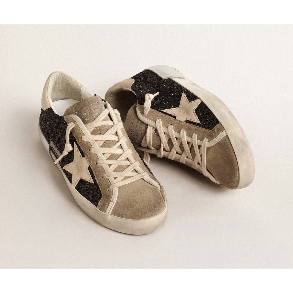 Scarpe Ginnastica super-star dell’oca dorata in glitter neri con stella crema e inserti in pelle scamosciata GWF00587.F004683.90401