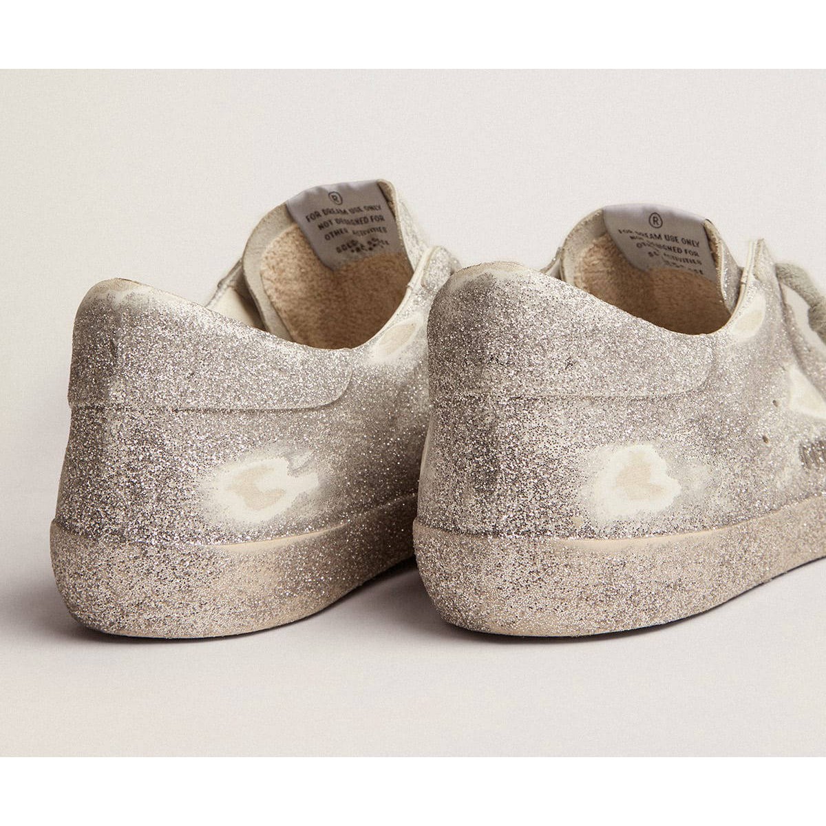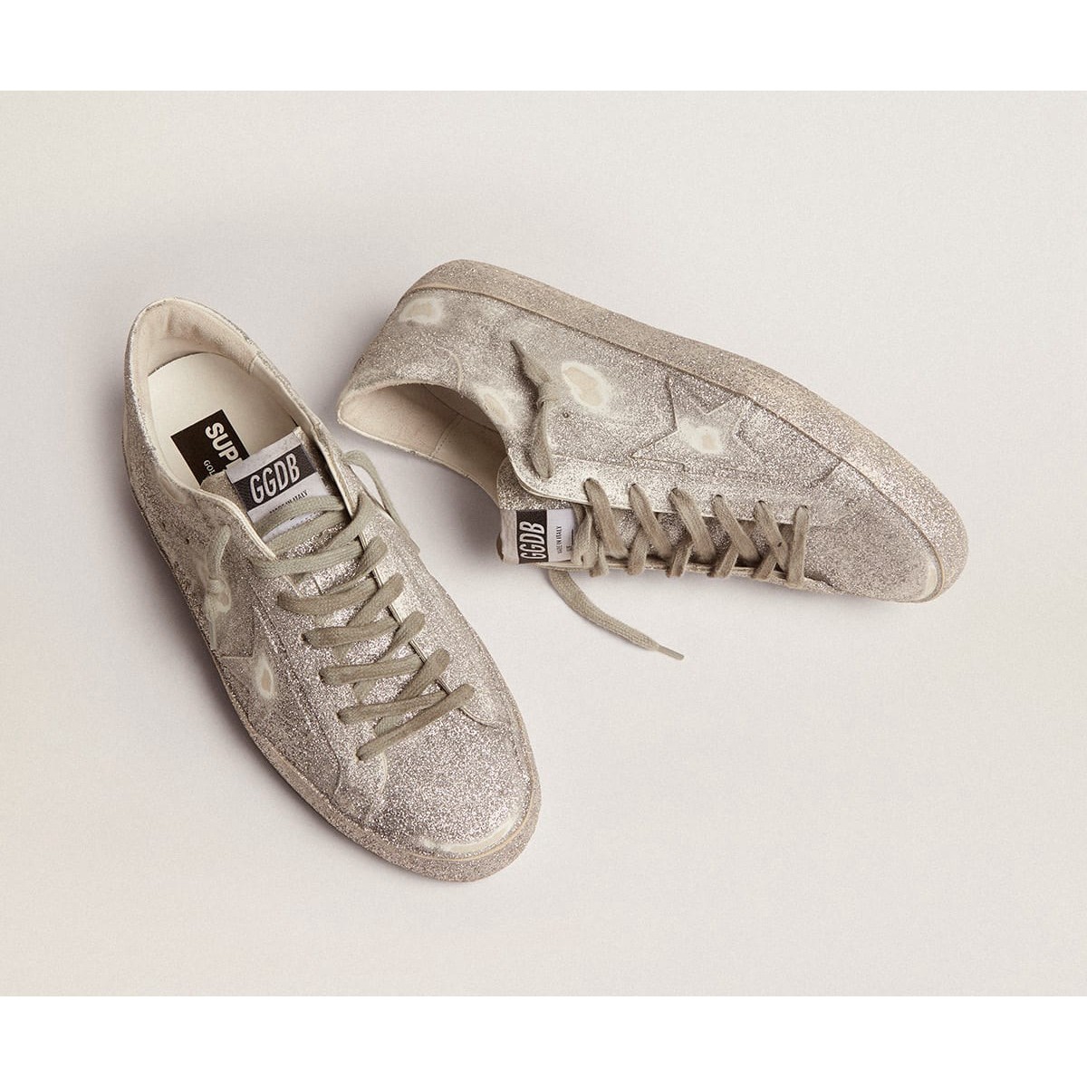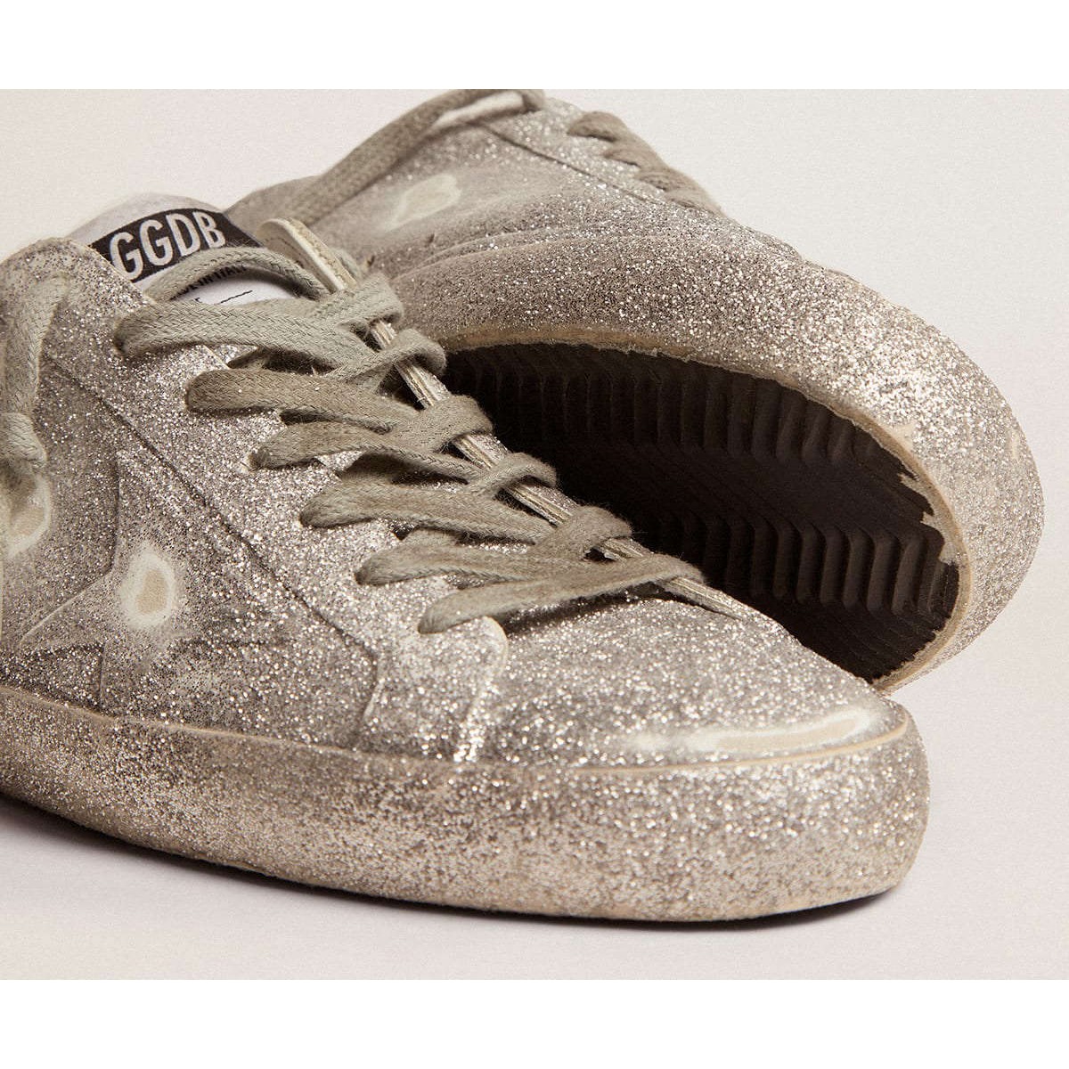 Un’icona senza tempo, ma una costante evoluzione. A Golden, adoriamo prendere i nostri classici e rielaborarli sempre, sempre da una nuova prospettiva. Queste scarpe da ginnastica super star presentano una tomaia in pelle d’argento, stella e tacco con polvere glitter all-over. Le lettere Galvanic Silver Metal GGDB aggiunge il tocco finale.