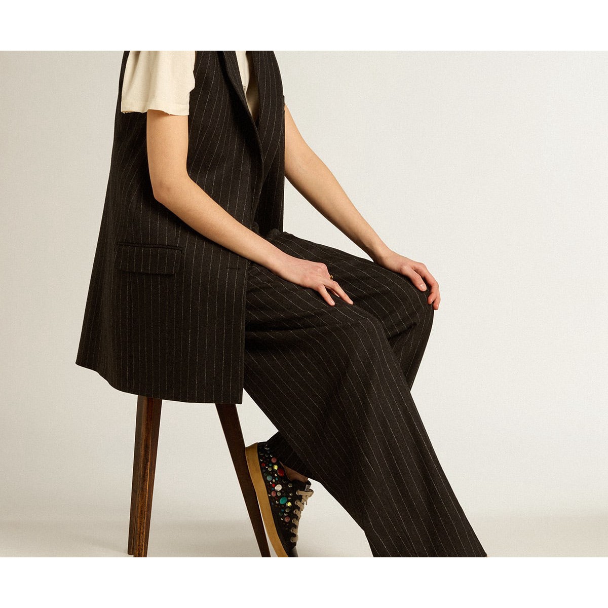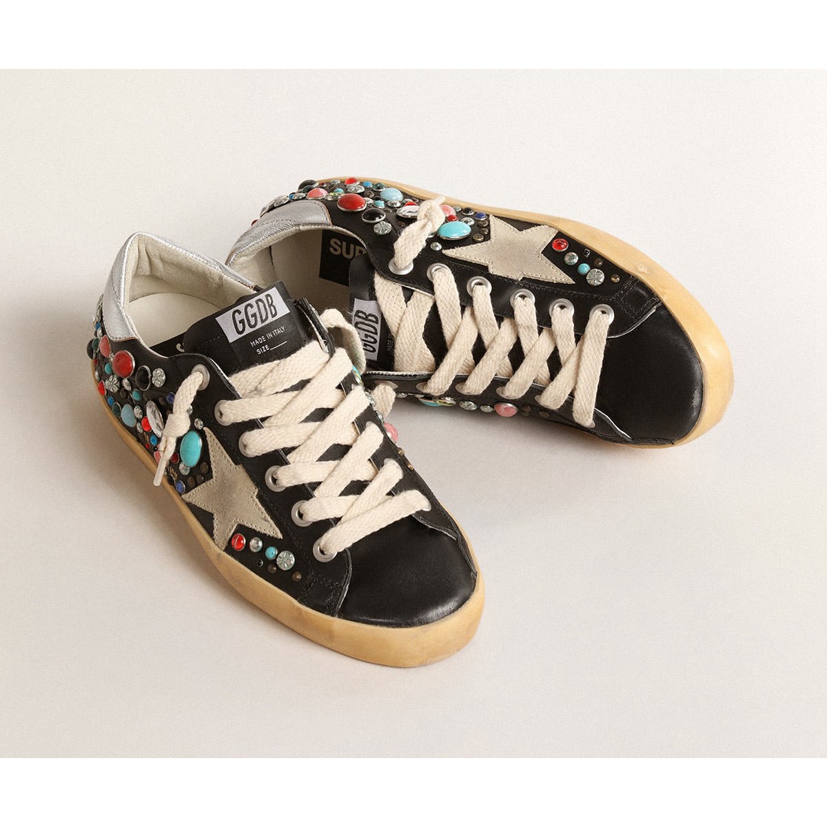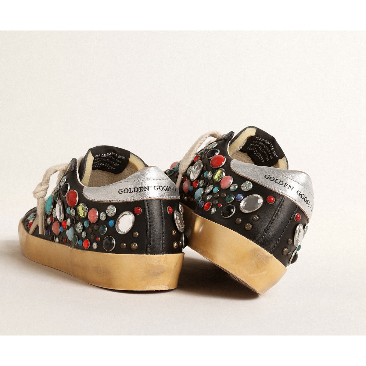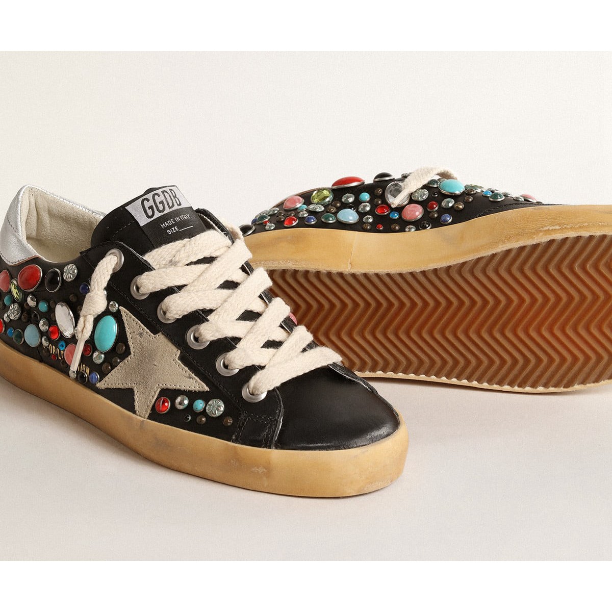 Un’icona senza tempo eppure una che è in continua evoluzione. A Golden, adoriamo prendere i nostri classici e rielaborarli sempre, sempre da una nuova prospettiva. Con una tomaia in pelle nera decorata con borchie e cristalli multicolori, questi super star presentano una stella in pelle scamosciata beige e una linguetta in pelle metallica argentata. E lacci bianchi aggiungono il tocco finale.