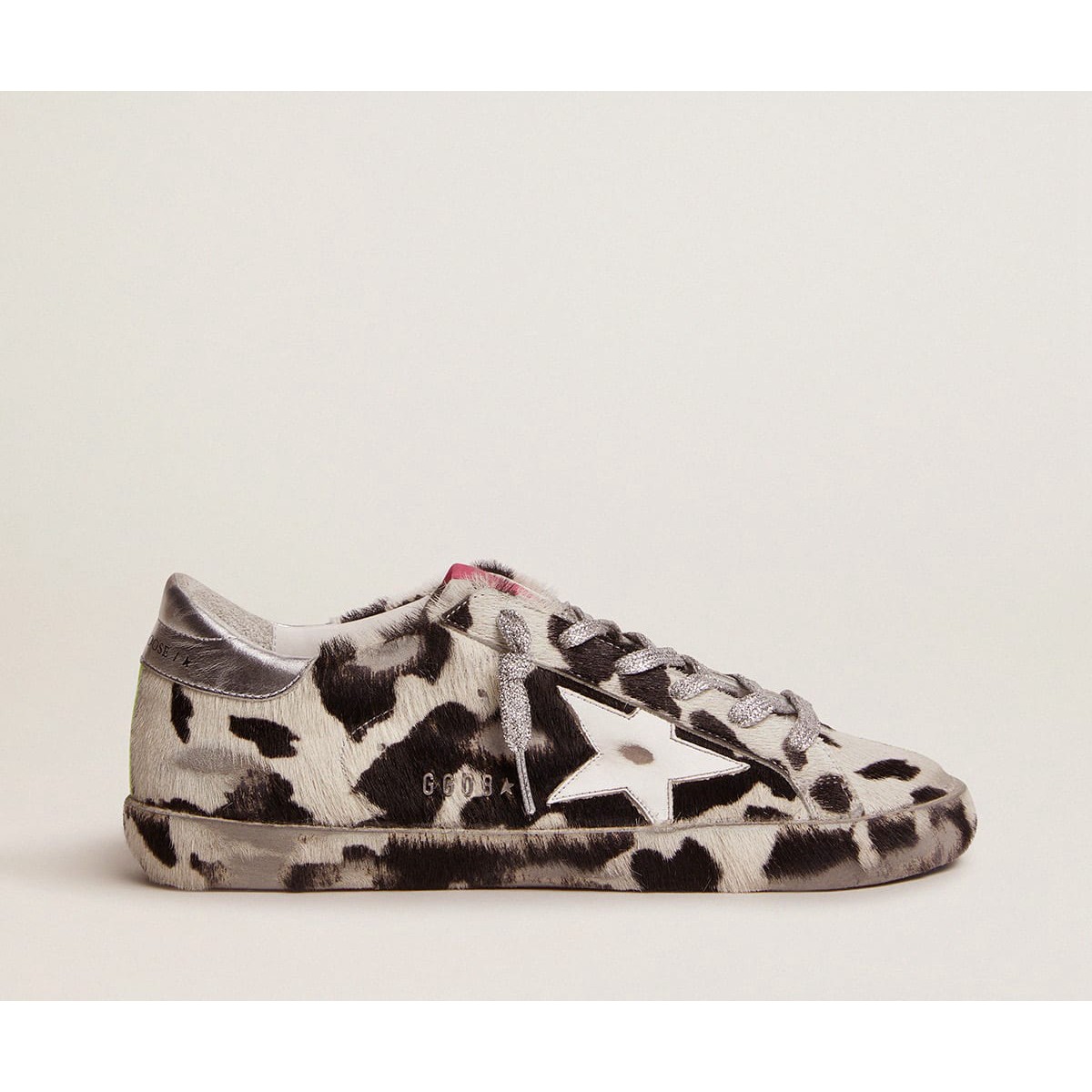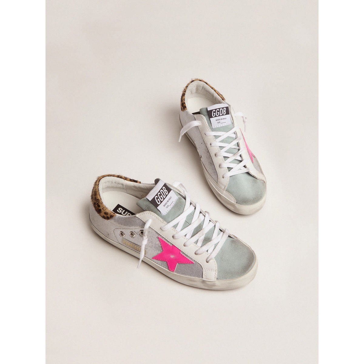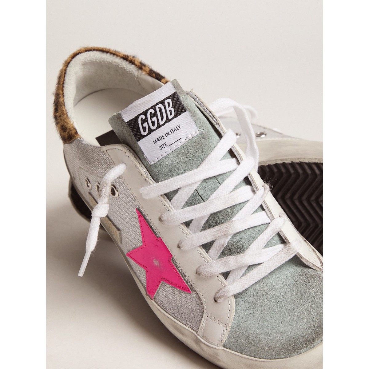 Adoriamo contrasti e sorprese e ci piace sperimentare materiali apparentemente opposti per creare nuove versioni uniche. Come con queste scarpe da ginnastica super star, in cui abbiamo scoscimenti e paillettes miscelati per la tomaia, una scheda del tallone della pelle di pony leopardo e una star di Fuchsia. . GWF00101.F001053.80804