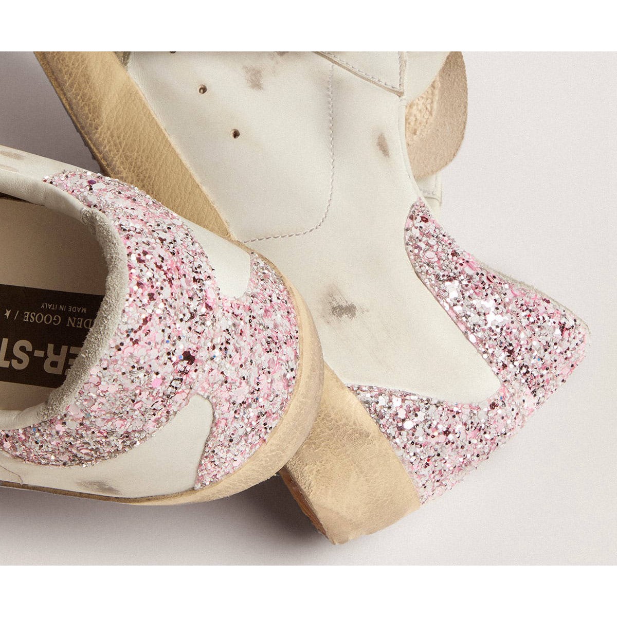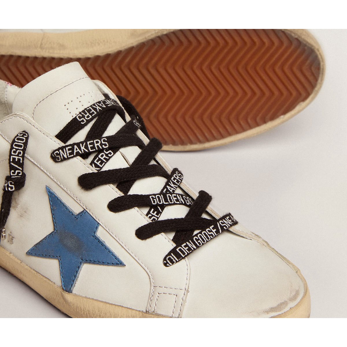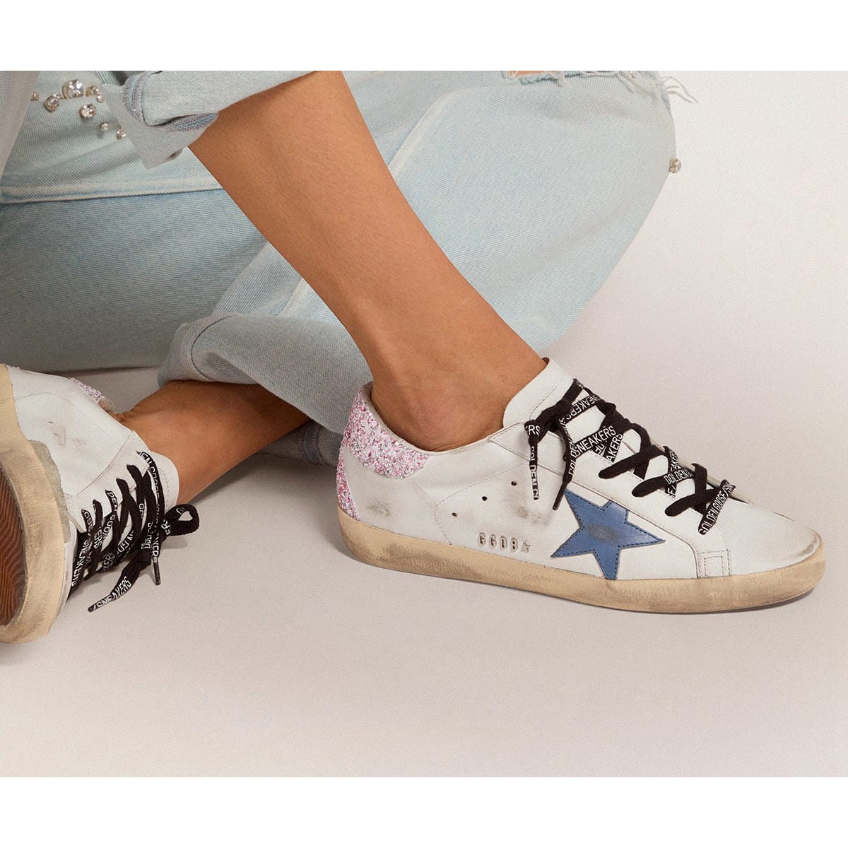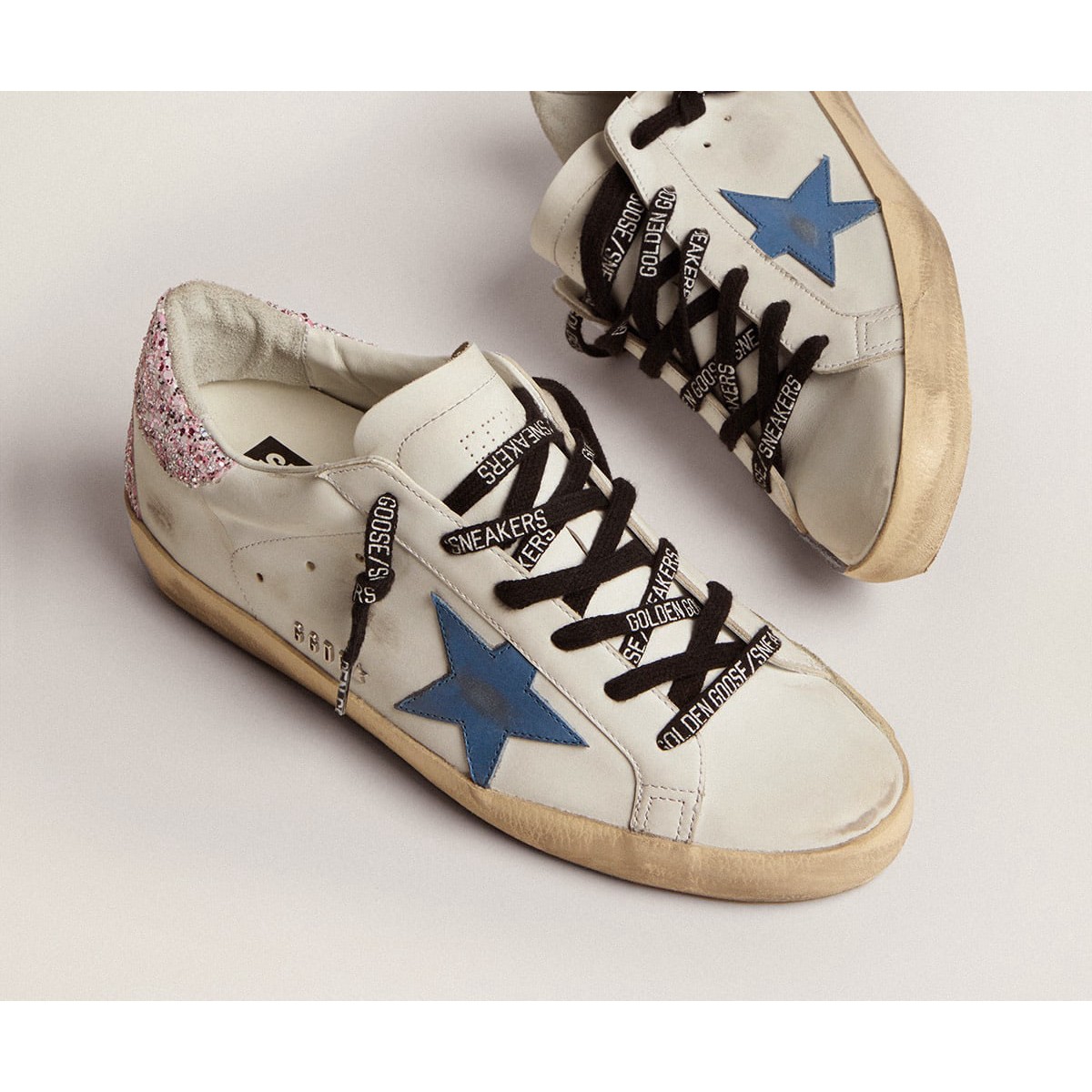 Un’icona senza tempo eppure una costante evoluzione. A Golden, adoriamo prendere i nostri classici e rielaborarli sempre, sempre da una nuova prospettiva. Queste scarpe da ginnastica super star con una tomaia in pelle bianca presentano una stella in pelle blu cobalto e una linguetta glitter rosa. Le lettere Galvanic Silver Metal GGDB aggiunge il tocco finale.