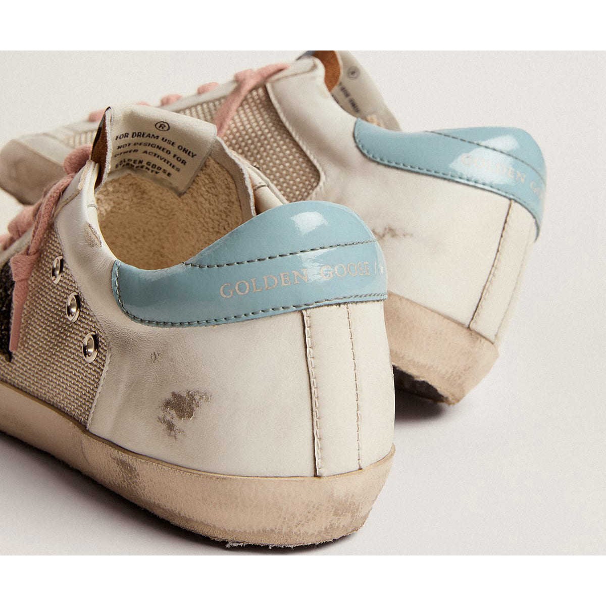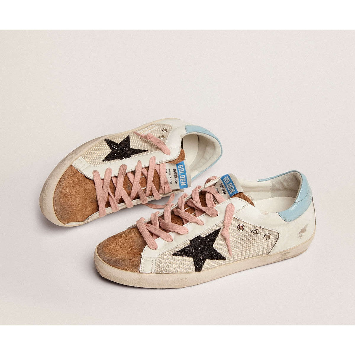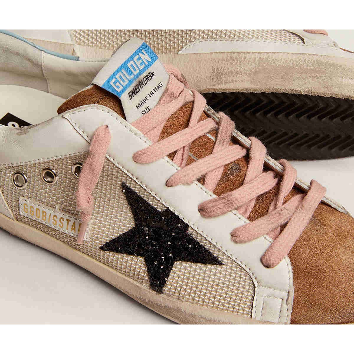 Un’icona senza tempo, ma una costante evoluzione. A Golden, adoriamo prendere i nostri classici e rielaborarli sempre, sempre da una nuova prospettiva. Questo modello, con una maglia grigio chiaro e una tomaia in pelle bianca, presenta una stella glitter nera e una linguetta del tallone navlak azzurro. La lingua in pelle scamosciata color tabacco e lacci rosa aggiungono il tocco finale.