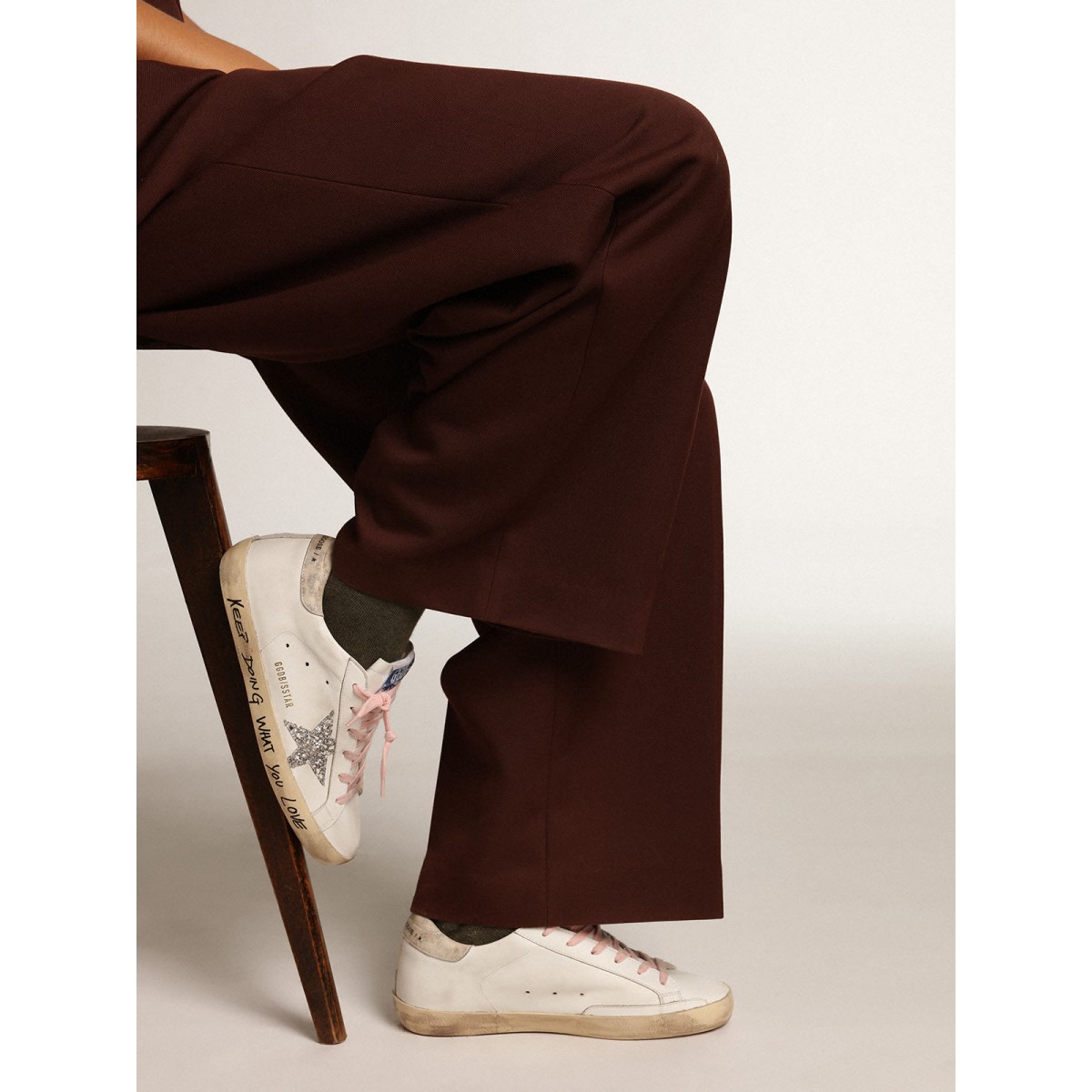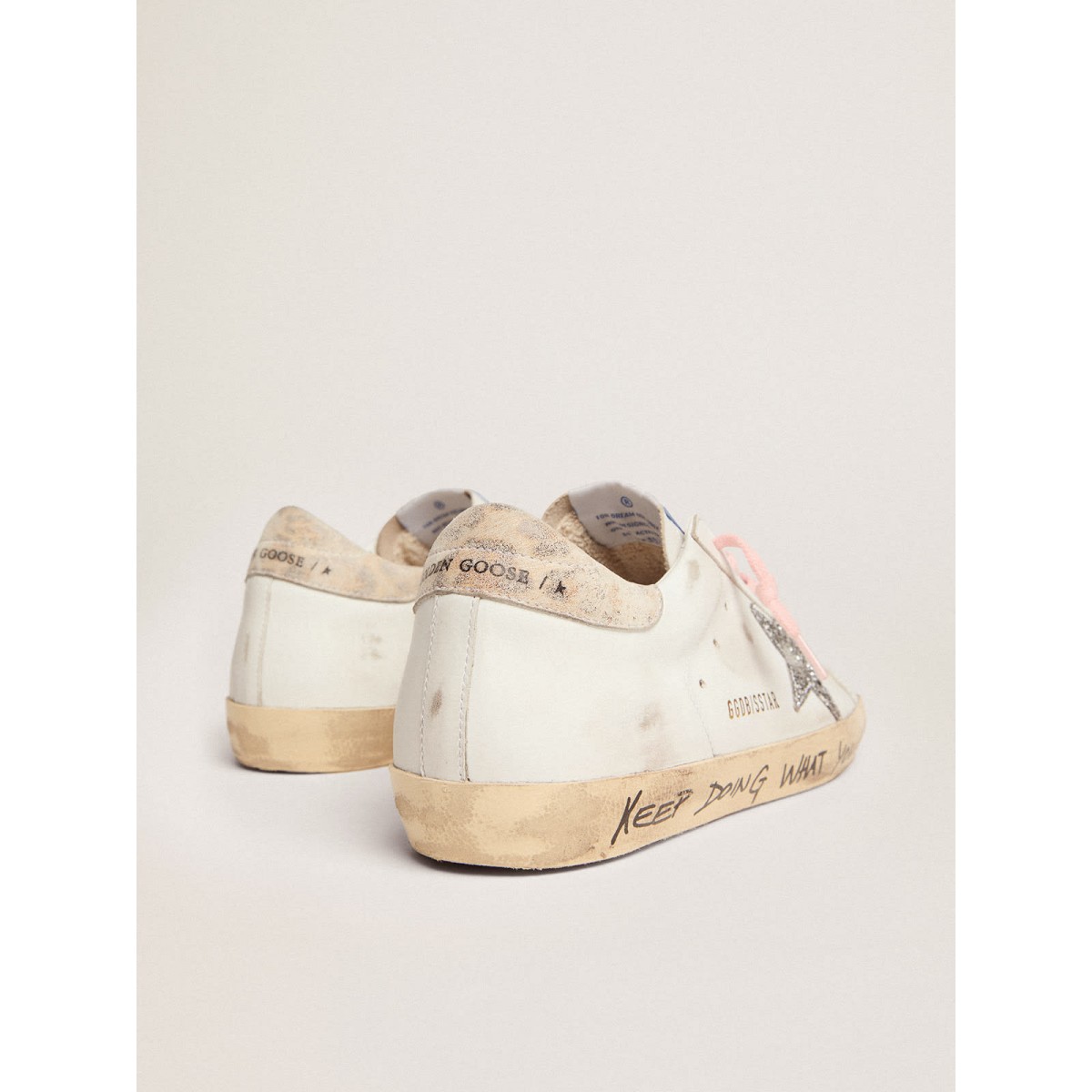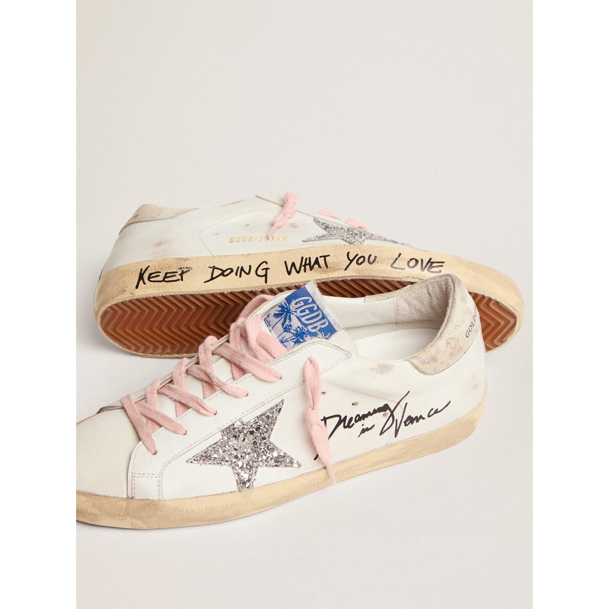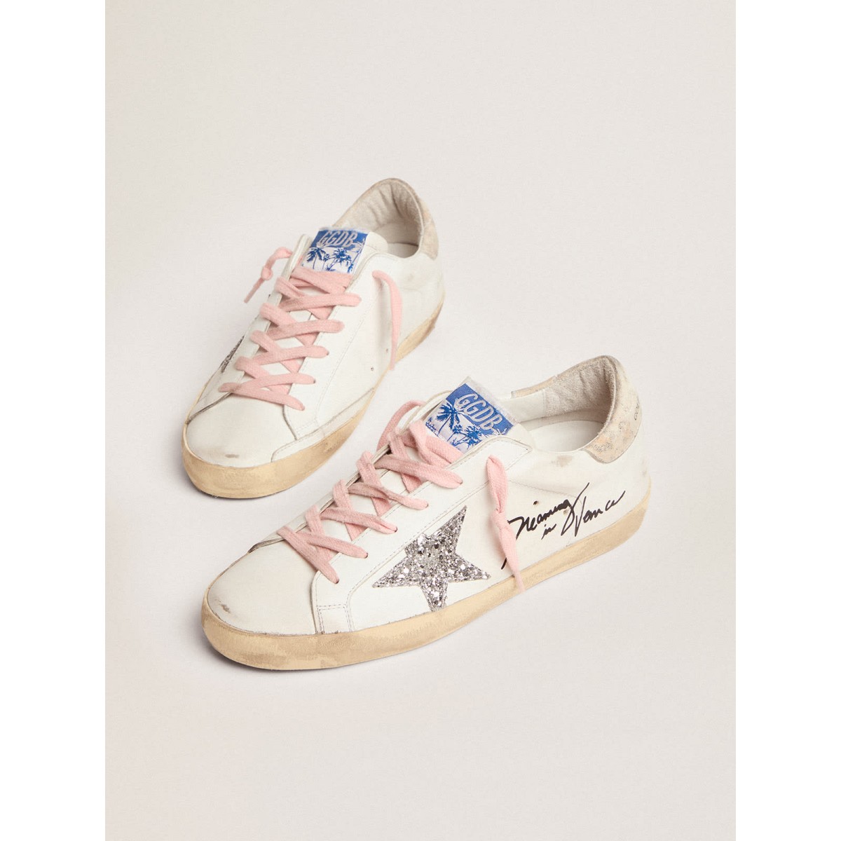 Un’icona senza tempo eppure è in continua evoluzione. A Golden, adoriamo prendere i nostri classici e rielaborarli sempre, sempre da una nuova prospettiva. Questo modello con una tomaia in pelle bianca presenta una stella glitter d’argento e una linguetta di cuoio in pelle leopardata a effetto beige. Le lettere di contrasto nero sulla tomaia e la volpe e i lacci rosa aggiungono il tocco finale.