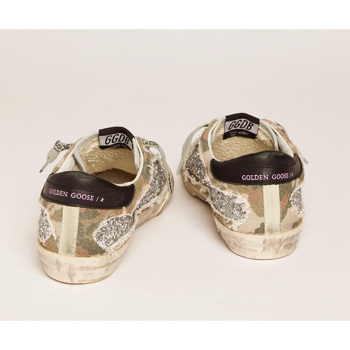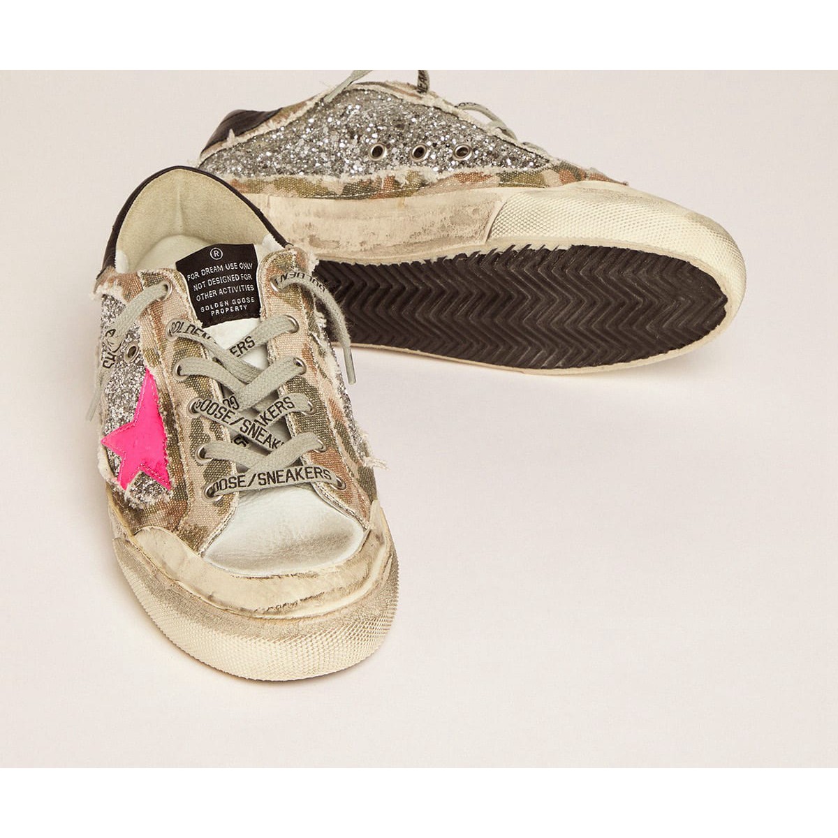 Un’icona senza tempo eppure che è in continua evoluzione. A Golden, adoriamo prendere i nostri classici e rielaborarli sempre, sempre da una nuova prospettiva. Queste scarpe da ginnastica super star presentano una tomaia glitter in argento a cui è stato aggiunto uno strato di tela a stampa mimetica con un effetto strappato. La scheda del tallone in pelle nera e la stella in pelle Fuchsia aggiungono i tocchi finali.