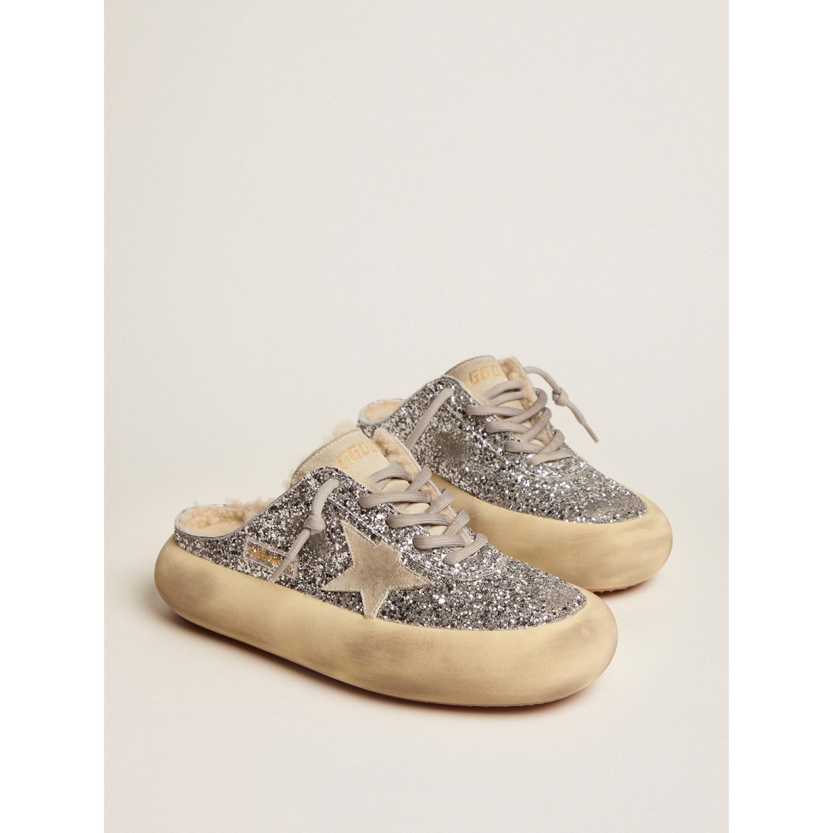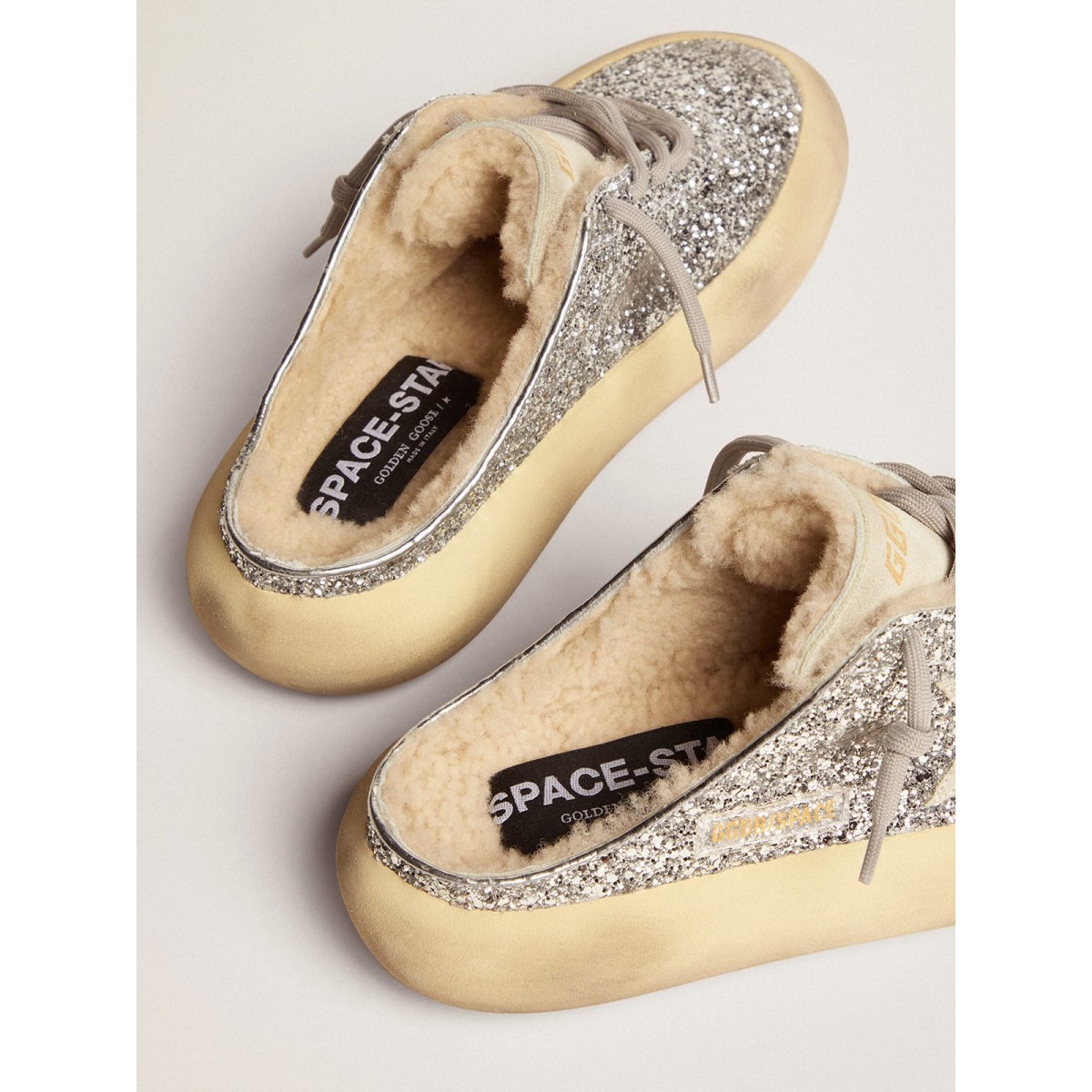 Il tuo nuovo momento per staccare dalla realtà e volare come mai prima d’ora. Avvolto in quell’incredibile sensazione di leggerezza fin dal primo secondo, facendo spazio alla versione più audace di te stesso. Finalmente libera il tuo stile, svuotando la tua mente. Le scarpe Space-Star presentano la suola e la sola imbottiti di memory foam, garantendo comfort senza pari a partire dal primo passo. In Silver Glitter, questa versione di Sabot si distingue a causa della sua stella e della lingua Appliquéd in pelle scamosciata grigio ghiaccio. La fodera morbida di shearling completa l’aspetto.