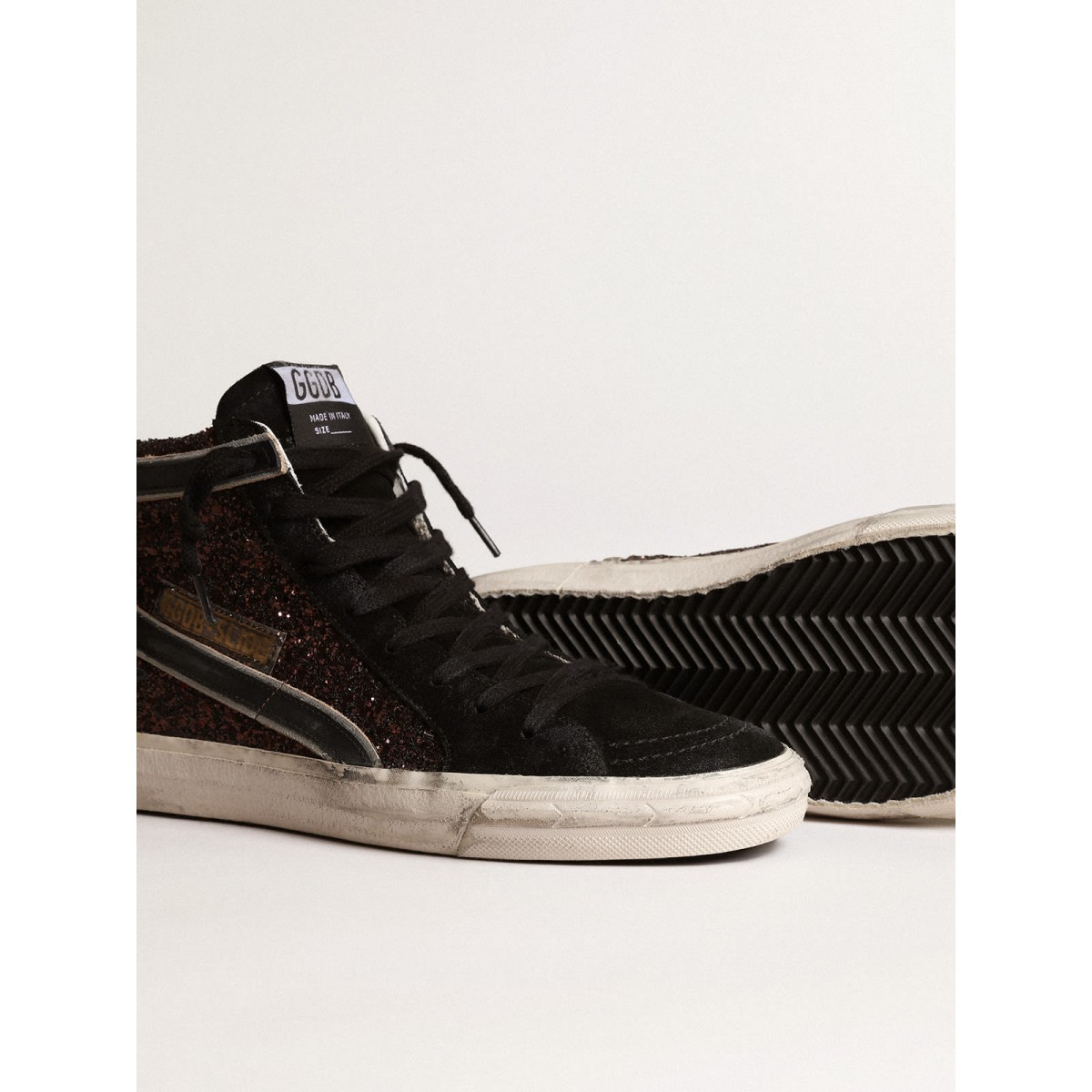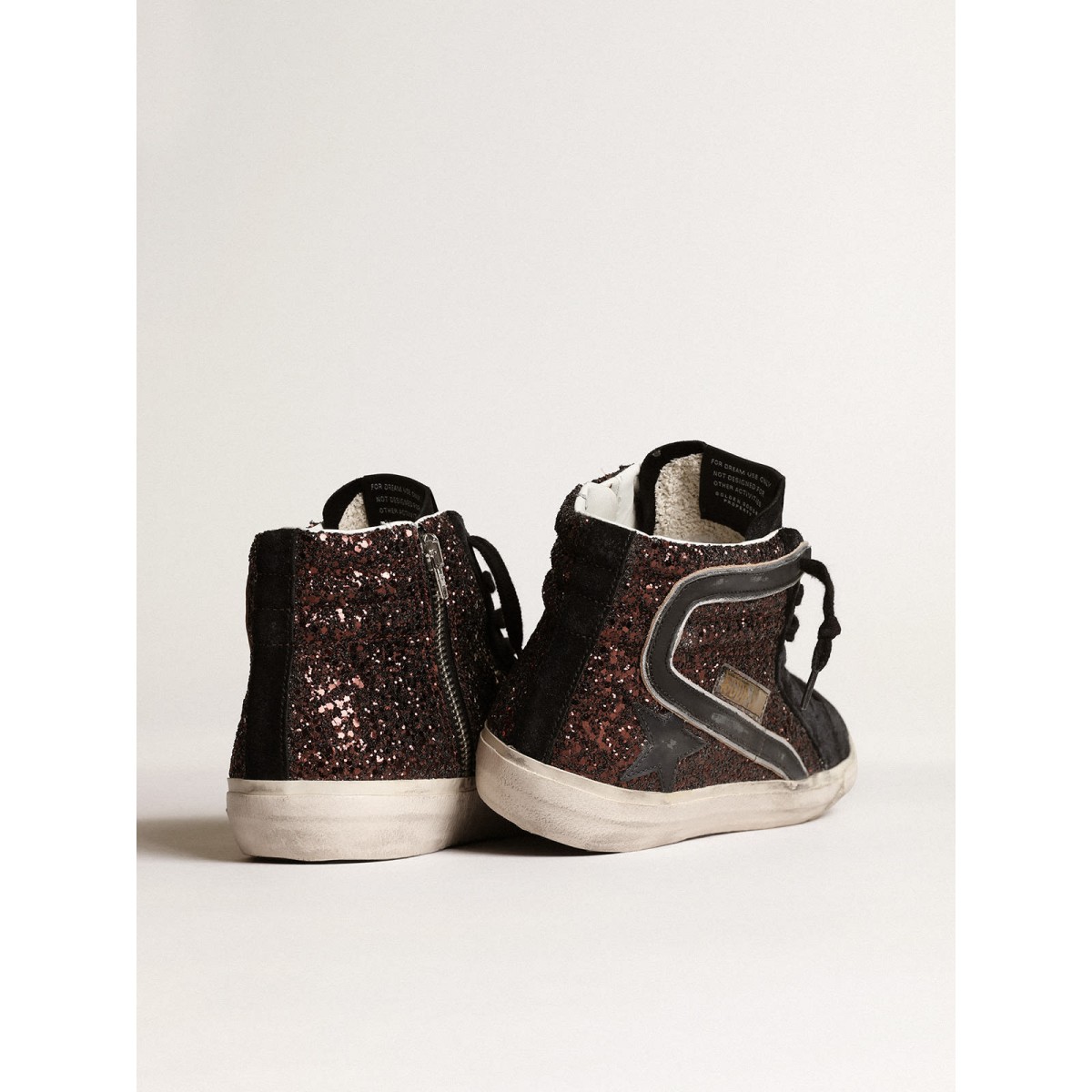 Skate Soul, atteggiamento glamour. Le nostre Scarpe Ginnastica da scivolo ti portano direttamente a Venezia Beach, tra un Ollie e un calcio d’inizio. Questo modello con una tomaia glitter marrone accentuata con inserti in pelle scamosciata nera presenta dettagli in pelle nera come la stella e il flash bordato con in pelle metallica d’argento. E lacci neri aggiungono il tocco finale.