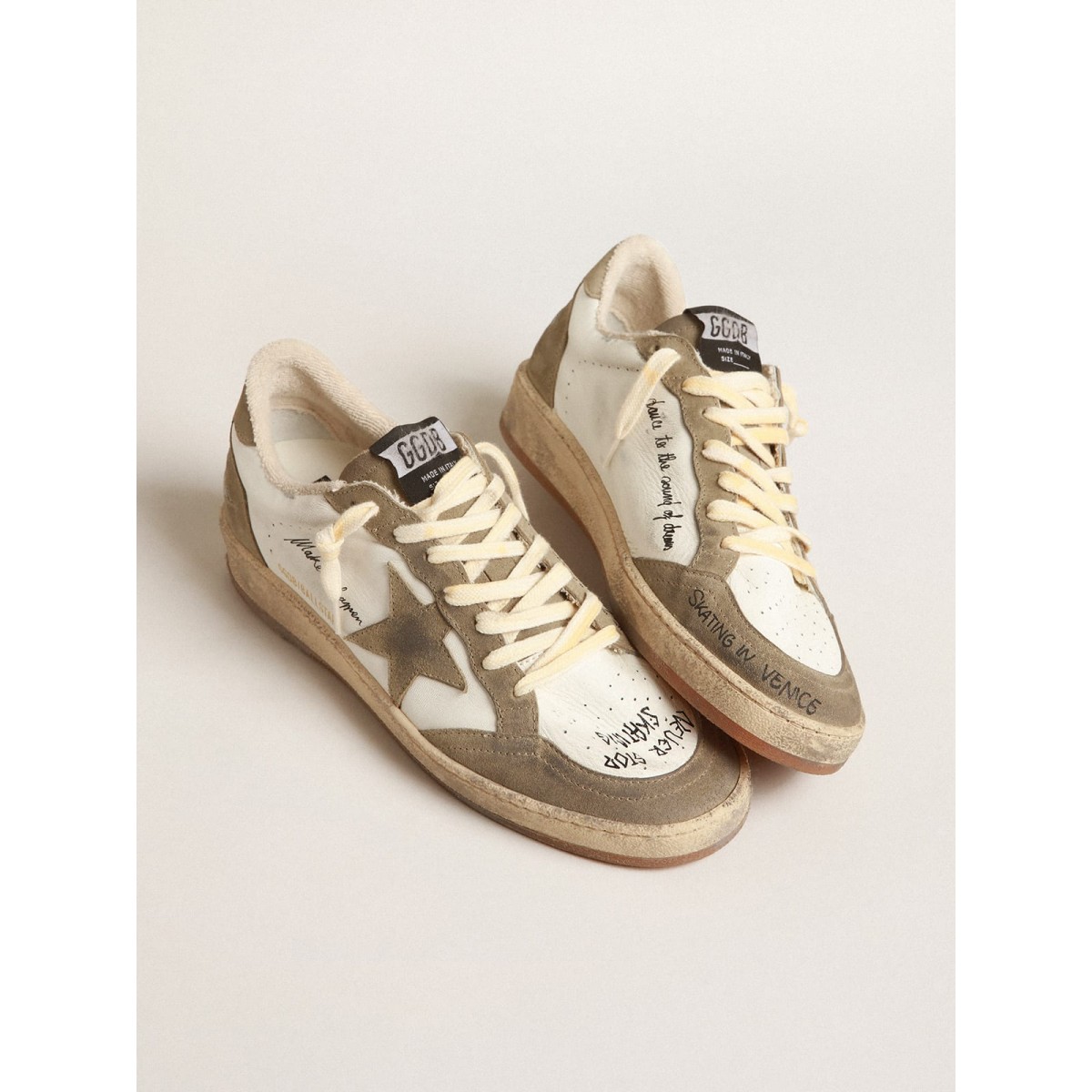 Sognando gli anni Ottanta. Le nostre Scarpe Ginnastica a stella della palla hanno un’atmosfera universitaria americana catturata tra un tiro a cerchio e un giro di skateboard. Con una tomaia in pelle bianca Nappa, questo modello da uomo presenta inserti in pelle scamosciata grigio-grigio, tra cui la scheda Star and Heel. Il motivo con lettere nera contrastanti e i lacci color crema aggiungono il tocco finale: cose belle che non passano mai di moda.