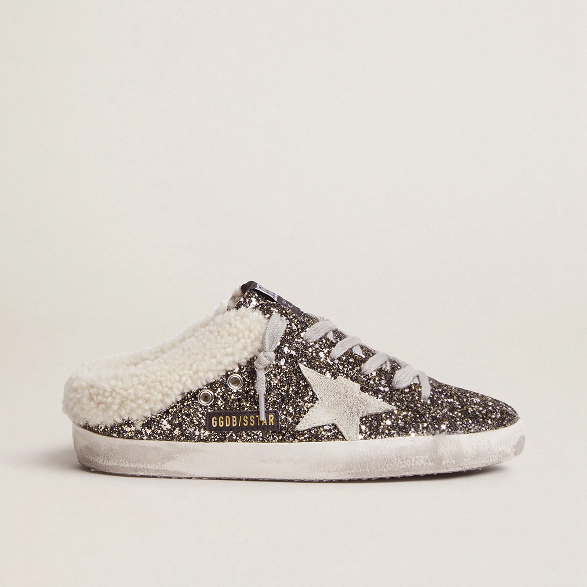 Sabot Golden Goose Super-Star in pelle bianca e pelle scamosciata grigia con stella glitter d’argento GWF00110.F001722.81194