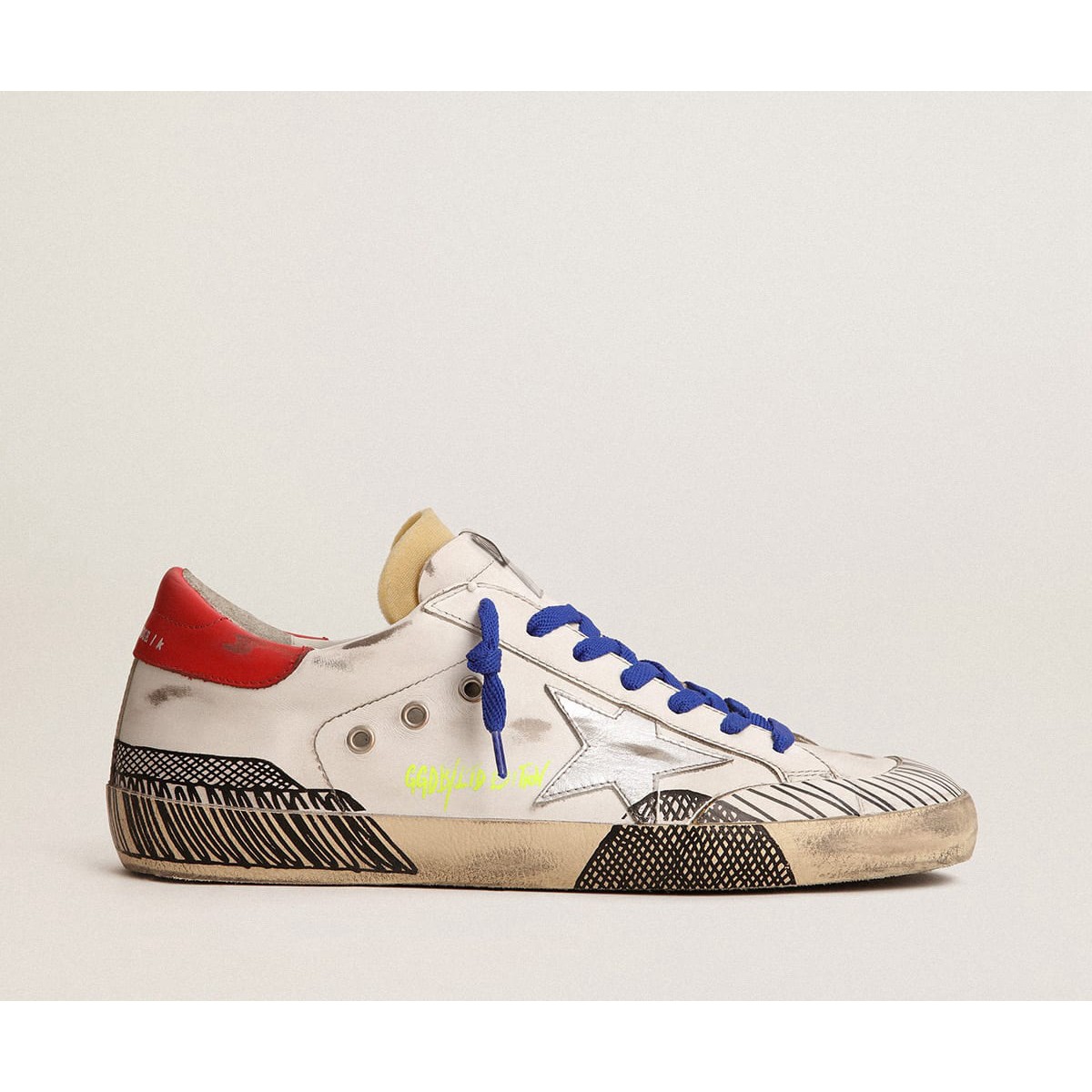 Laboratorio di Scarpe Ginnastica super-star d’Ogra d’oro in pelle bianca e stampa a car-foxing-effetto GWF00107.F002401.10852